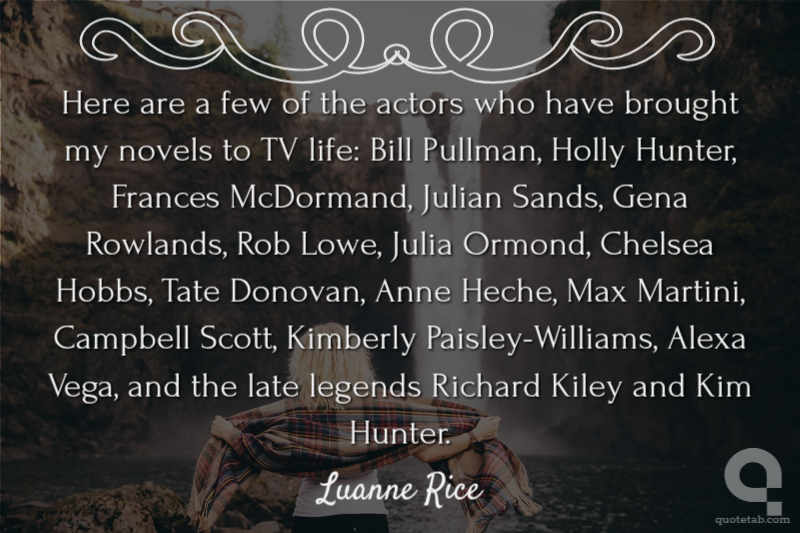 Here are a few of the actors who have brought my novels to TV life: Bill Pullman, Holly Hunter, Frances McDormand, Julian Sands, Gena Rowlands, Rob Lowe, Julia Ormond, Chelsea Hobbs, Tate Donovan, Anne Heche, Max Martini, Campbell Scott, Kimberly Paisley-Williams, Alexa Vega, and the late legends Richard Kiley and Kim Hunter.
