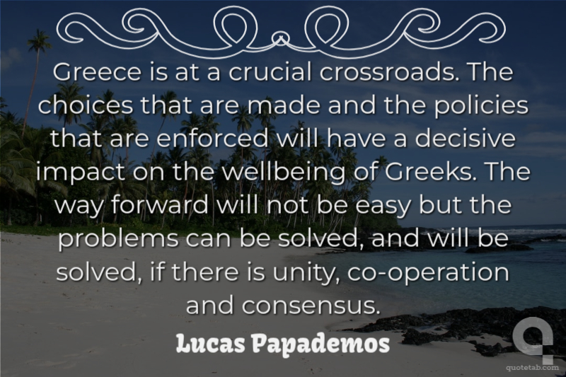 Greece is at a crucial crossroads. The choices that are made and the policies that are enforced will have a decisive impact on the wellbeing of Greeks. The way forward will not be easy but the problems can be solved, and will be solved, if there is unity, co-operation and consensus.
