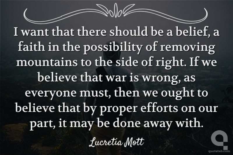 I want that there should be a belief, a faith in the possibility of removing mountains to the side of right. If we believe that war is wrong, as everyone must, then we ought to believe that by proper efforts on our part, it may be done away with.