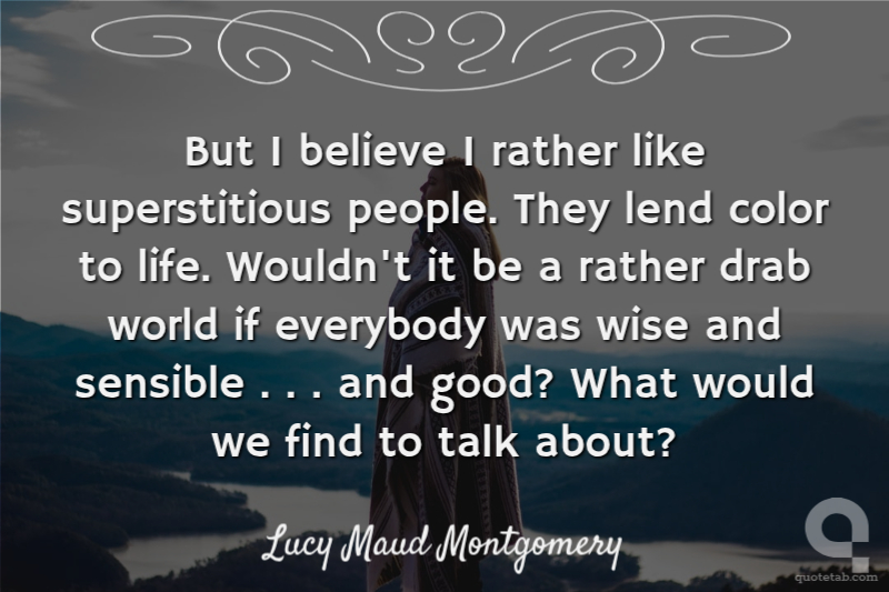 But I believe I rather like superstitious people. They lend color to life. Wouldn't it be a rather drab world if everybody was wise and sensible . . . and good? What would we find to talk about?