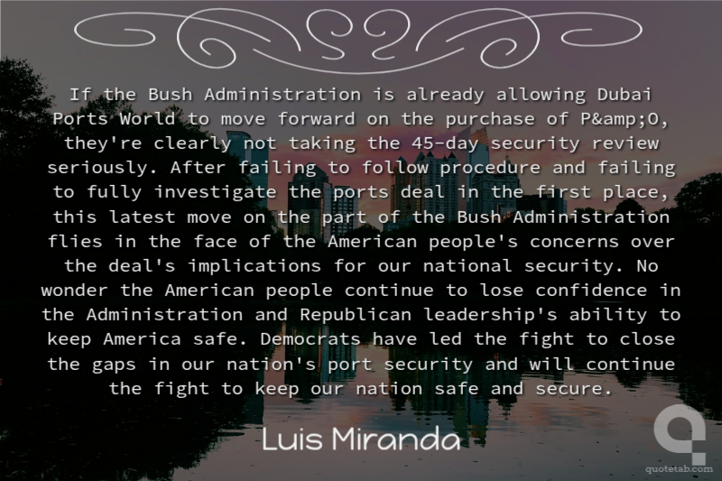 If the Bush Administration is already allowing Dubai Ports World to move forward on the purchase of P&O, they're clearly not taking the 45-day security review seriously. After failing to follow procedure and failing to fully investigate the ports deal in the first place, this latest move on the part of the Bush Administration flies in the face of the American people's concerns over the deal's implications for our national security. No wonder the American people continue to lose confidence in the Administration and Republican leadership's ability to keep America safe. Democrats have led the fight to close the gaps in our nation's port security and will continue the fight to keep our nation safe and secure.