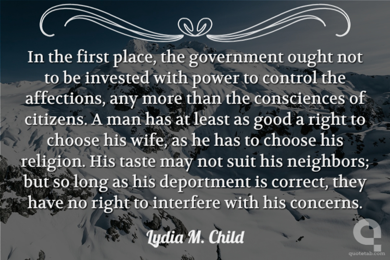 In the first place, the government ought not to be invested with power to control the affections, any more than the consciences of citizens. A man has at least as good a right to choose his wife, as he has to choose his religion. His taste may not suit his neighbors; but so long as his deportment is correct, they have no right to interfere with his concerns.