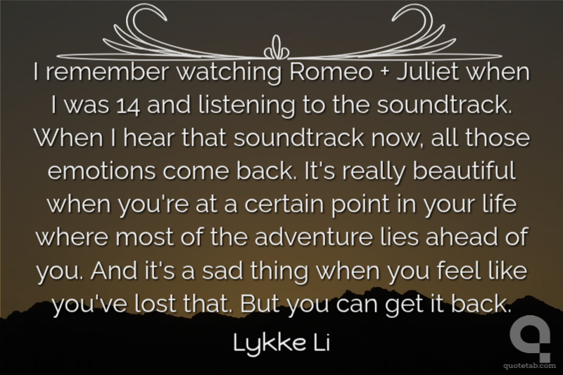 I remember watching Romeo + Juliet when I was 14 and listening to the soundtrack. When I hear that soundtrack now, all those emotions come back. It's really beautiful when you're at a certain point in your life where most of the adventure lies ahead of you. And it's a sad thing when you feel like you've lost that. But you can get it back.