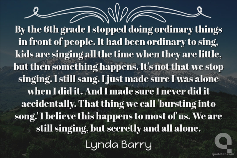 By the 6th grade I stopped doing ordinary things in front of people. It had been ordinary to sing, kids are singing all the time when they are little, but then something happens. It's not that we stop singing. I still sang. I just made sure I was alone when I did it. And I made sure I never did it accidentally. That thing we call 'bursting into song.' I believe this happens to most of us. We are still singing, but secretly and all alone.