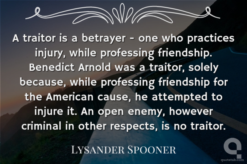 A traitor is a betrayer - one who practices injury, while professing friendship. Benedict Arnold was a traitor, solely because, while professing friendship for the American cause, he attempted to injure it. An open enemy, however criminal in other respects, is no traitor.