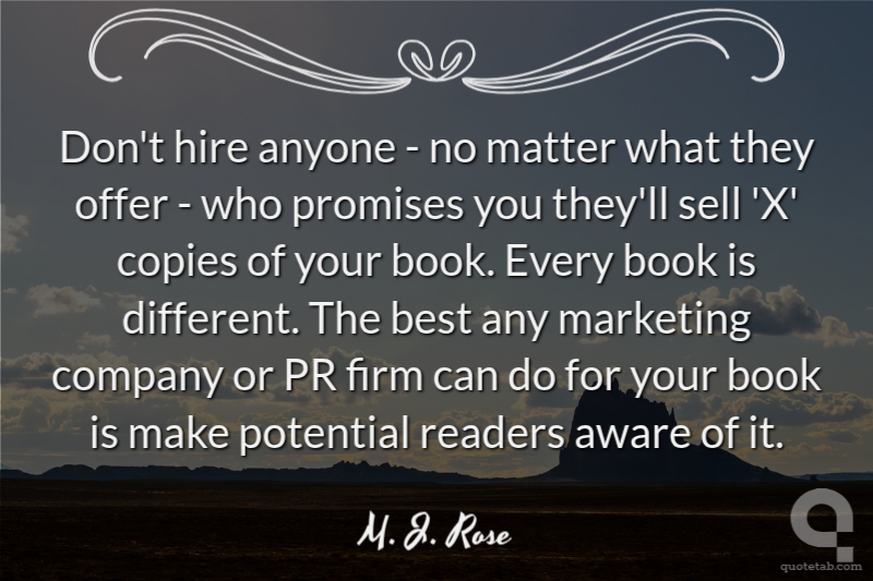 Don't hire anyone - no matter what they offer - who promises you they'll sell 'X' copies of your book. Every book is different. The best any marketing company or PR firm can do for your book is make potential readers aware of it.