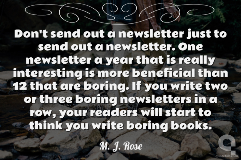 Don't send out a newsletter just to send out a newsletter. One newsletter a year that is really interesting is more beneficial than 12 that are boring. If you write two or three boring newsletters in a row, your readers will start to think you write boring books.