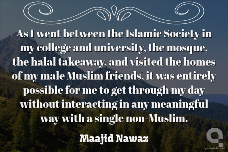 As I went between the Islamic Society in my college and university, the mosque, the halal takeaway, and visited the homes of my male Muslim friends, it was entirely possible for me to get through my day without interacting in any meaningful way with a single non-Muslim.