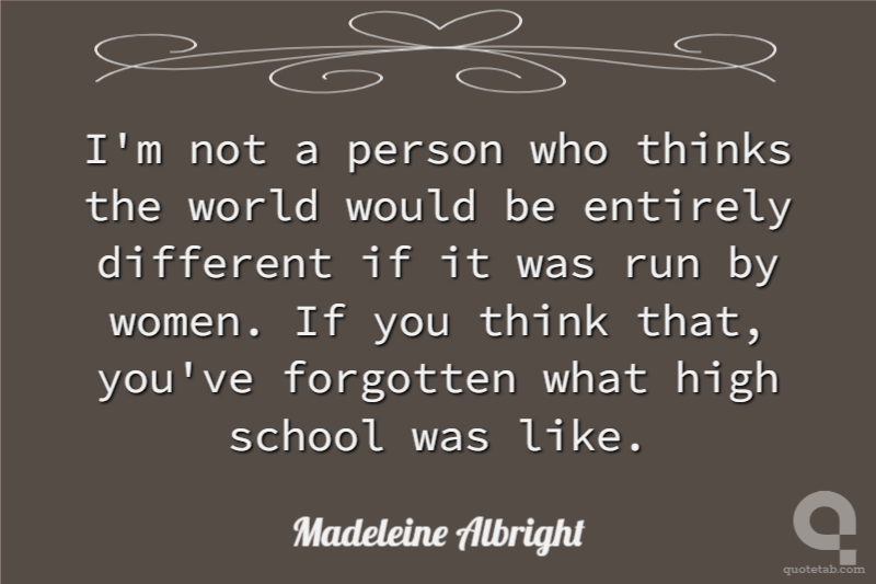 I'm not a person who thinks the world would be entirely different if it was run by women. If you think that, you've forgotten what high school was like.