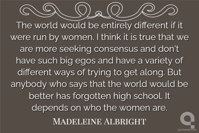 The world would be entirely different if it were run by women. I think it is true that we are more seeking consensus and don't have such big egos and have a variety of different ways of trying to get along. But anybody who says that the world would be better has forgotten high school. It depends on who the women are.