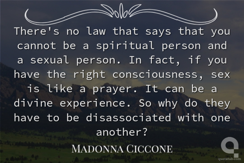 There's no law that says that you cannot be a spiritual person and a sexual person. In fact, if you have the right consciousness, sex is like a prayer. It can be a divine experience. So why do they have to be disassociated with one another?