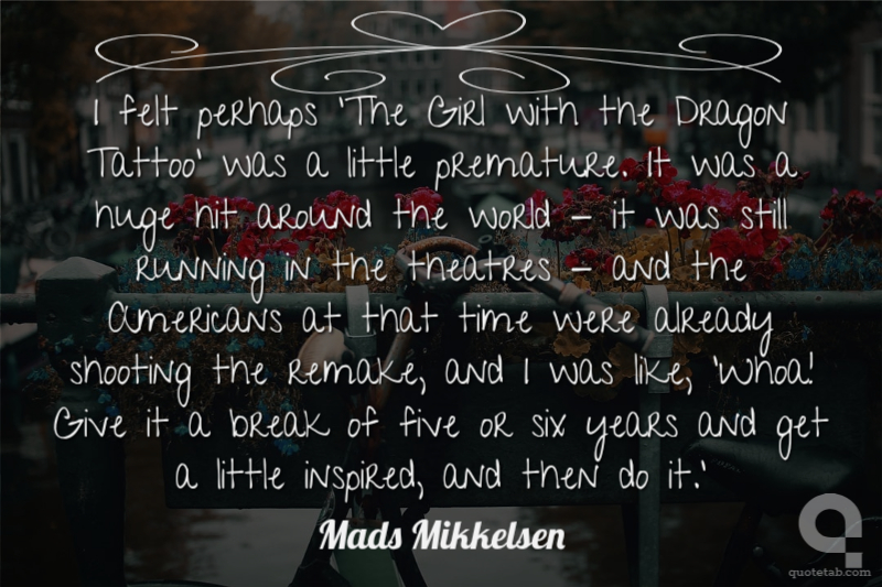 I felt perhaps 'The Girl with the Dragon Tattoo' was a little premature. It was a huge hit around the world - it was still running in the theatres - and the Americans at that time were already shooting the remake, and I was like, 'Whoa! Give it a break of five or six years and get a little inspired, and then do it.'