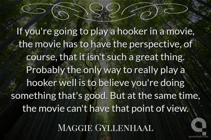 If you're going to play a hooker in a movie, the movie has to have the perspective, of course, that it isn't such a great thing. Probably the only way to really play a hooker well is to believe you're doing something that's good. But at the same time, the movie can't have that point of view.