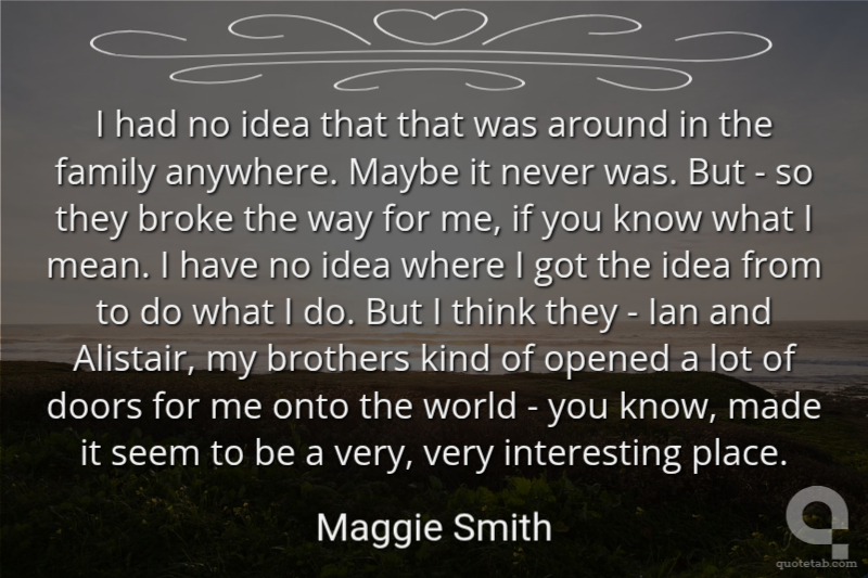 I had no idea that that was around in the family anywhere. Maybe it never was. But - so they broke the way for me, if you know what I mean. I have no idea where I got the idea from to do what I do. But I think they - Ian and Alistair, my brothers kind of opened a lot of doors for me onto the world - you know, made it seem to be a very, very interesting place.