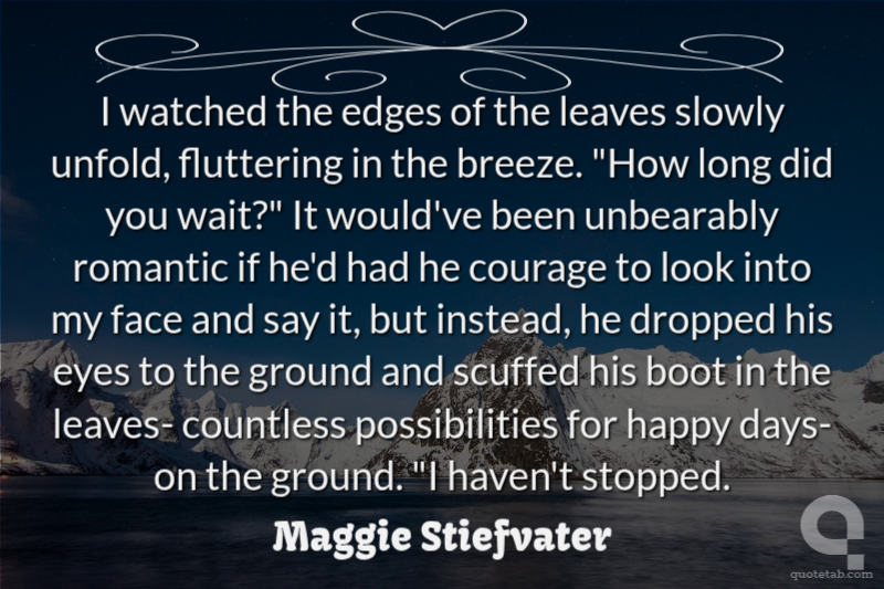 I watched the edges of the leaves slowly unfold, fluttering in the breeze. "How long did you wait?" It would've been unbearably romantic if he'd had he courage to look into my face and say it, but instead, he dropped his eyes to the ground and scuffed his boot in the leaves- countless possibilities for happy days- on the ground. "I haven't stopped.