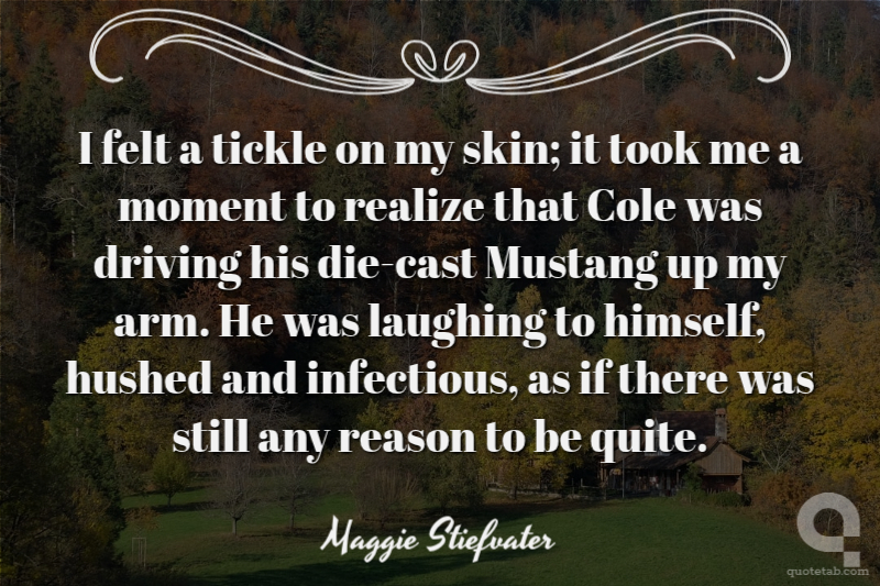 I felt a tickle on my skin; it took me a moment to realize that Cole was driving his die-cast Mustang up my arm. He was laughing to himself, hushed and infectious, as if there was still any reason to be quite.