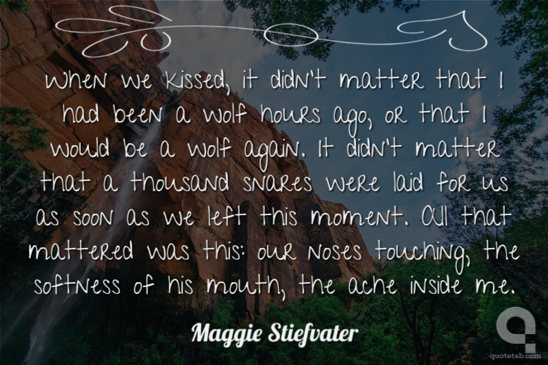 When we kissed, it didn't matter that I had been a wolf hours ago, or that I would be a wolf again. It didn't matter that a thousand snares were laid for us as soon as we left this moment. All that mattered was this: our noses touching, the softness of his mouth, the ache inside me.