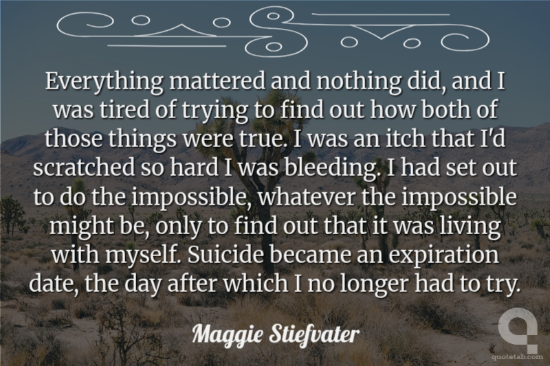 Everything mattered and nothing did, and I was tired of trying to find out how both of those things were true. I was an itch that I'd scratched so hard I was bleeding. I had set out to do the impossible, whatever the impossible might be, only to find out that it was living with myself. Suicide became an expiration date, the day after which I no longer had to try.