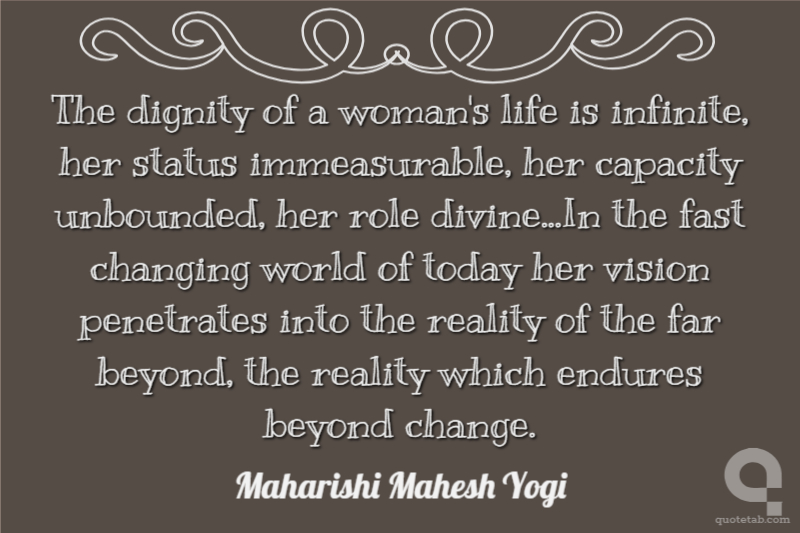The dignity of a woman's life is infinite, her status immeasurable, her capacity unbounded, her role divine...In the fast changing world of today her vision penetrates into the reality of the far beyond, the reality which endures beyond change.