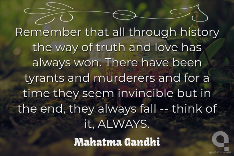 Remember that all through history the way of truth and love has always won. There have been tyrants and murderers and for a time they seem invincible but in the end, they always fall -- think of it, ALWAYS.