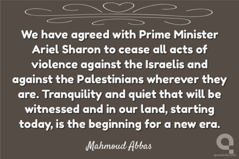 We have agreed with Prime Minister Ariel Sharon to cease all acts of violence against the Israelis and against the Palestinians wherever they are. Tranquility and quiet that will be witnessed and in our land, starting today, is the beginning for a new era.