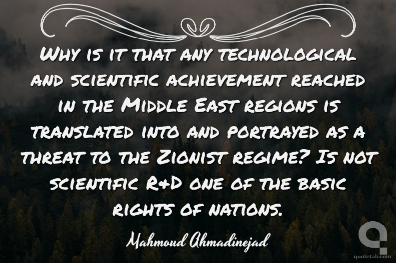 Why is it that any technological and scientific achievement reached in the Middle East regions is translated into and portrayed as a threat to the Zionist regime? Is not scientific R&D one of the basic rights of nations.