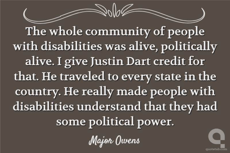 The whole community of people with disabilities was alive, politically alive. I give Justin Dart credit for that. He traveled to every state in the country. He really made people with disabilities understand that they had some political power.