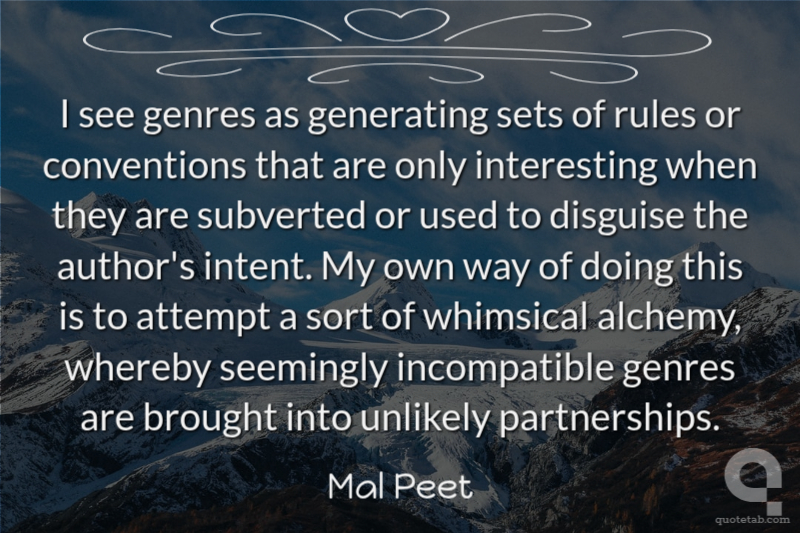 I see genres as generating sets of rules or conventions that are only interesting when they are subverted or used to disguise the author's intent. My own way of doing this is to attempt a sort of whimsical alchemy, whereby seemingly incompatible genres are brought into unlikely partnerships.