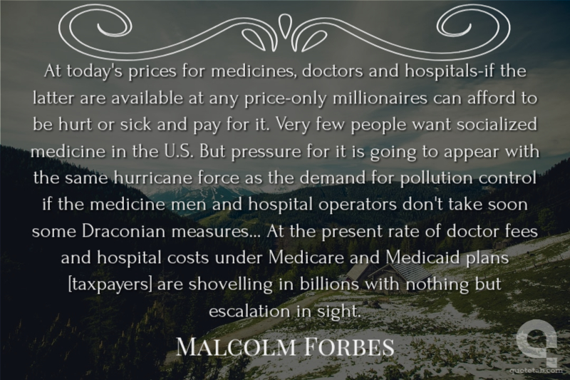 At today's prices for medicines, doctors and hospitals-if the latter are available at any price-only millionaires can afford to be hurt or sick and pay for it. Very few people want socialized medicine in the U.S. But pressure for it is going to appear with the same hurricane force as the demand for pollution control if the medicine men and hospital operators don't take soon some Draconian measures... At the present rate of doctor fees and hospital costs under Medicare and Medicaid plans [taxpayers] are shovelling in billions with nothing but escalation in sight.