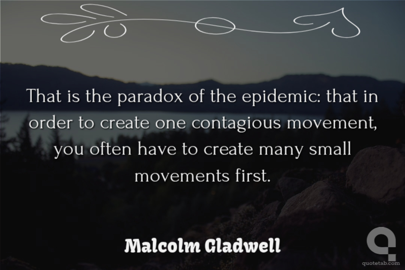 That is the paradox of the epidemic: that in order to create one contagious movement, you often have to create many small movements first.