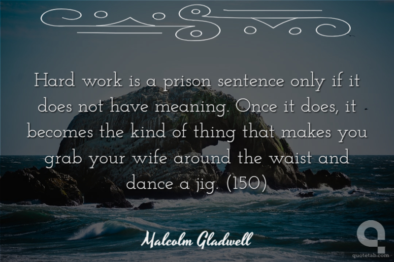 Hard work is a prison sentence only if it does not have meaning. Once it does, it becomes the kind of thing that makes you grab your wife around the waist and dance a jig. (150)