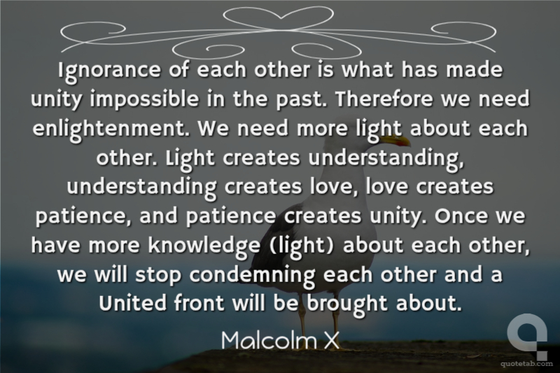 Ignorance of each other is what has made unity impossible in the past. Therefore we need enlightenment. We need more light about each other. Light creates understanding, understanding creates love, love creates patience, and patience creates unity. Once we have more knowledge (light) about each other, we will stop condemning each other and a United front will be brought about.