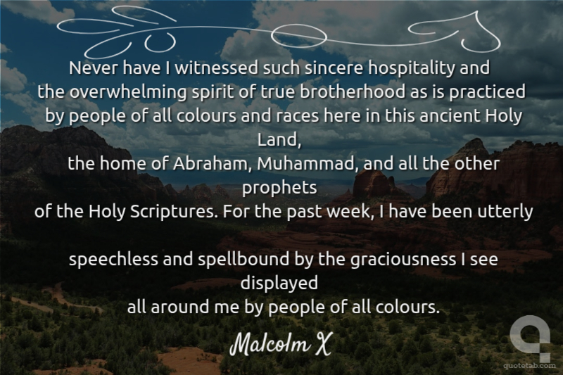 Never have I witnessed such sincere hospitality and the overwhelming spirit of true brotherhood as is practiced by people of all colours and races here in this ancient Holy Land, the home of Abraham, Muhammad, and all the other prophets of the Holy Scriptures. For the past week, I have been utterly speechless and spellbound by the graciousness I see displayed all around me by people of all colours.