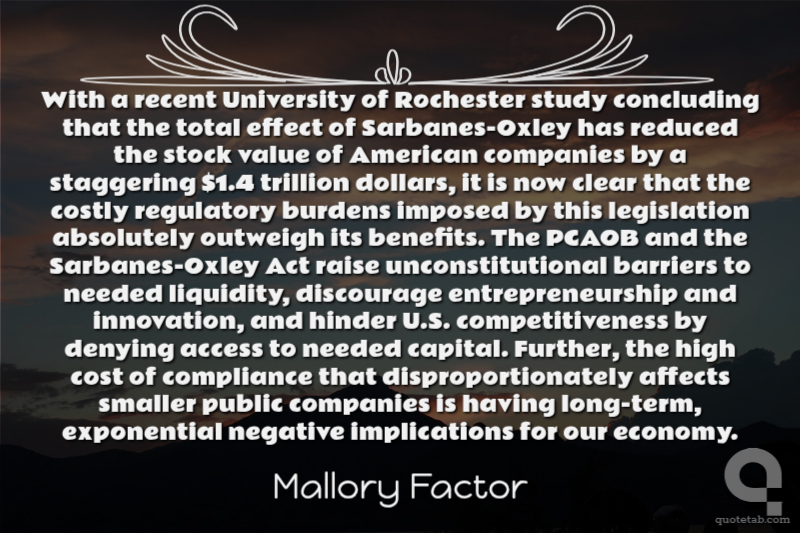 With a recent University of Rochester study concluding that the total effect of Sarbanes-Oxley has reduced the stock value of American companies by a staggering $1.4 trillion dollars, it is now clear that the costly regulatory burdens imposed by this legislation absolutely outweigh its benefits. The PCAOB and the Sarbanes-Oxley Act raise unconstitutional barriers to needed liquidity, discourage entrepreneurship and innovation, and hinder U.S. competitiveness by denying access to needed capital. Further, the high cost of compliance that disproportionately affects smaller public companies is having long-term, exponential negative implications for our economy.