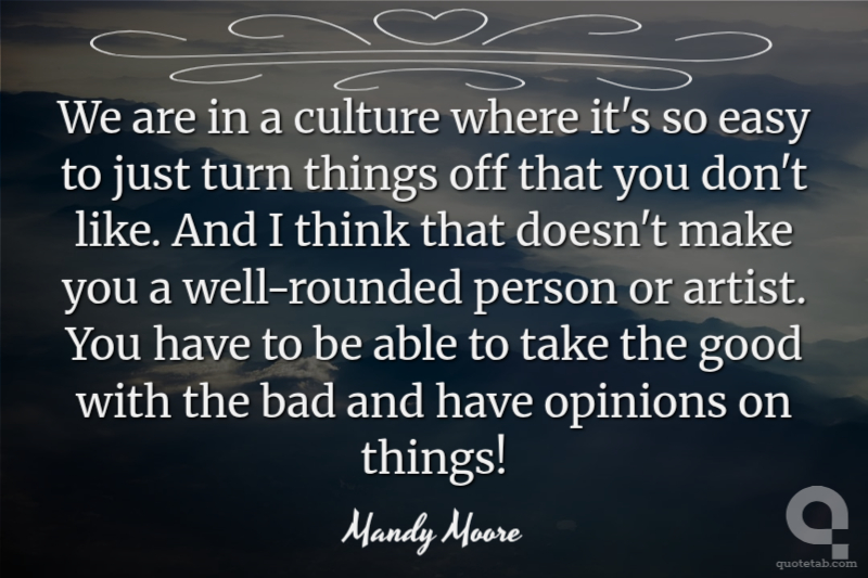 We are in a culture where it's so easy to just turn things off that you don't like. And I think that doesn't make you a well-rounded person or artist. You have to be able to take the good with the bad and have opinions on things!