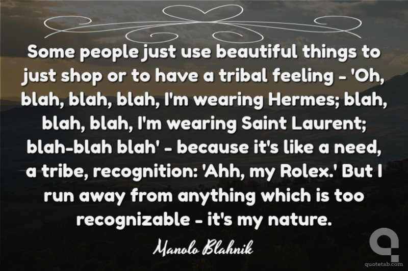 Some people just use beautiful things to just shop or to have a tribal feeling - 'Oh, blah, blah, blah, I'm wearing Hermes; blah, blah, blah, I'm wearing Saint Laurent; blah-blah blah' - because it's like a need, a tribe, recognition: 'Ahh, my Rolex.' But I run away from anything which is too recognizable - it's my nature.