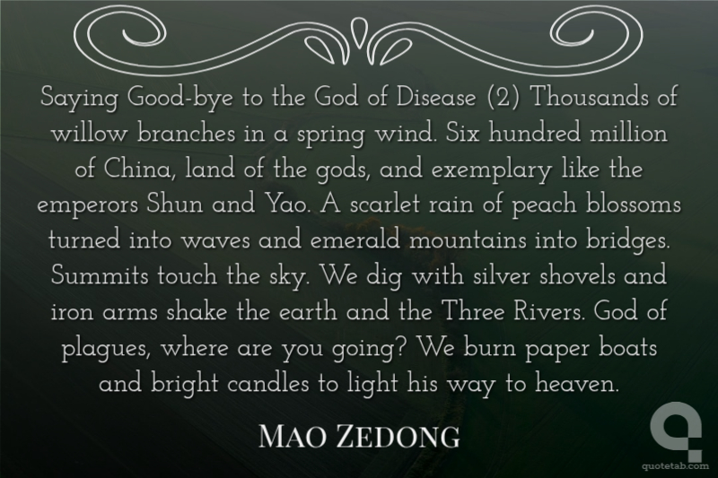 Saying Good-bye to the God of Disease (2) Thousands of willow branches in a spring wind. Six hundred million of China, land of the gods, and exemplary like the emperors Shun and Yao. A scarlet rain of peach blossoms turned into waves and emerald mountains into bridges. Summits touch the sky. We dig with silver shovels and iron arms shake the earth and the Three Rivers. God of plagues, where are you going? We burn paper boats and bright candles to light his way to heaven.