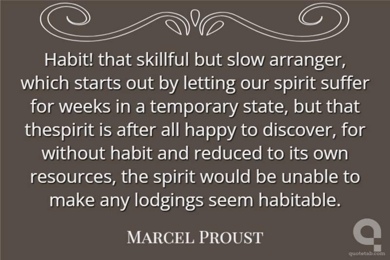 Habit! that skillful but slow arranger, which starts out by letting our spirit suffer for weeks in a temporary state, but that thespirit is after all happy to discover, for without habit and reduced to its own resources, the spirit would be unable to make any lodgings seem habitable.