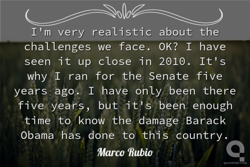 I'm very realistic about the challenges we face. OK? I have seen it up close in 2010. It's why I ran for the Senate five years ago. I have only been there five years, but it's been enough time to know the damage Barack Obama has done to this country.