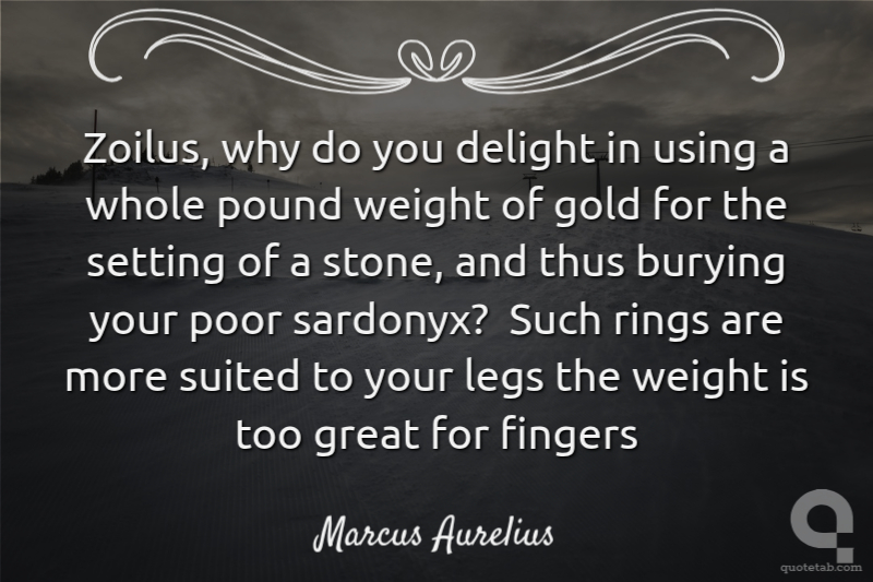 Zoilus, why do you delight in using a whole pound weight of gold for the setting of a stone, and thus burying your poor sardonyx? Such rings are more suited to your legs the weight is too great for fingers