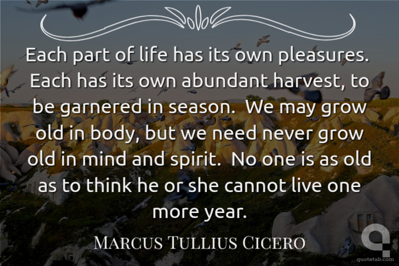 Each part of life has its own pleasures. Each has its own abundant harvest, to be garnered in season. We may grow old in body, but we need never grow old in mind and spirit. No one is as old as to think he or she cannot live one more year.