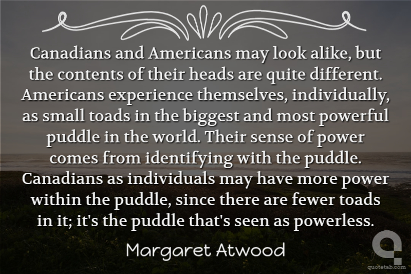 Canadians and Americans may look alike, but the contents of their heads are quite different. Americans experience themselves, individually, as small toads in the biggest and most powerful puddle in the world. Their sense of power comes from identifying with the puddle. Canadians as individuals may have more power within the puddle, since there are fewer toads in it; it's the puddle that's seen as powerless.