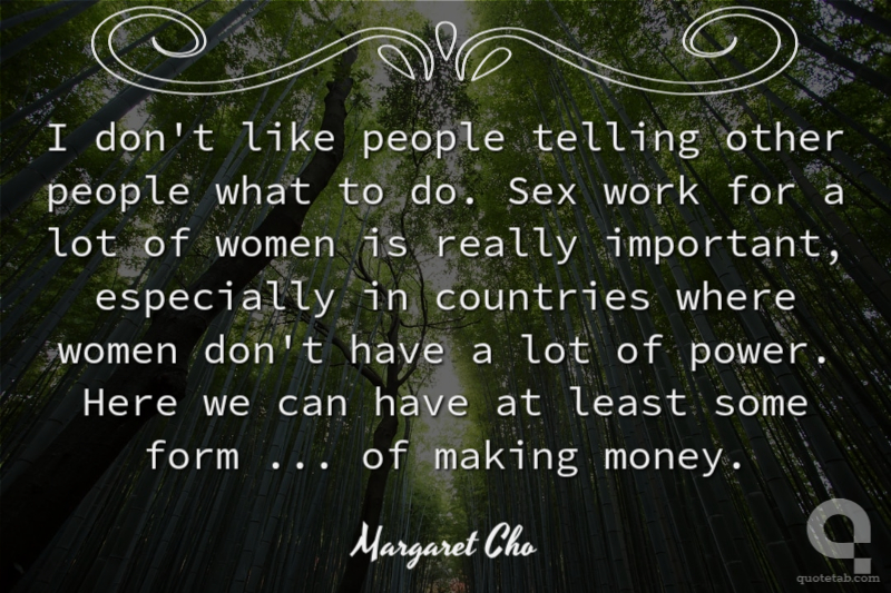 I don't like people telling other people what to do. Sex work for a lot of women is really important, especially in countries where women don't have a lot of power. Here we can have at least some form ... of making money.