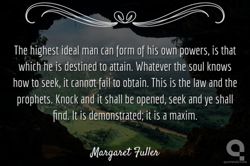 The highest ideal man can form of his own powers, is that which he is destined to attain. Whatever the soul knows how to seek, it cannot fail to obtain. This is the law and the prophets. Knock and it shall be opened, seek and ye shall find. It is demonstrated; it is a maxim.