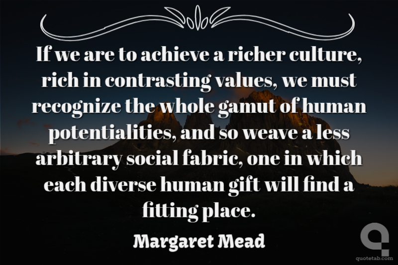 If we are to achieve a richer culture, rich in contrasting values, we must recognize the whole gamut of human potentialities, and so weave a less arbitrary social fabric, one in which each diverse human gift will find a fitting place.