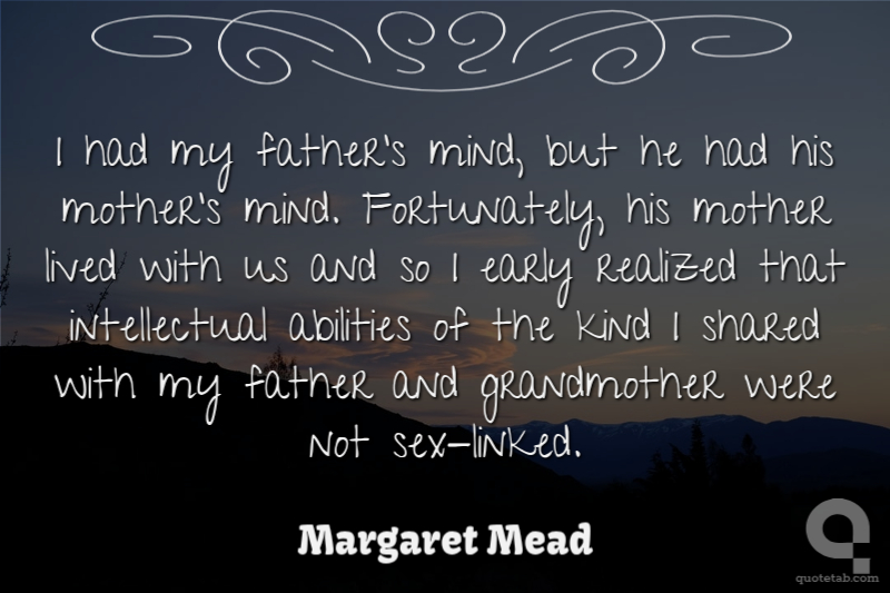 I had my father's mind, but he had his mother's mind. Fortunately, his mother lived with us and so I early realized that intellectual abilities of the kind I shared with my father and grandmother were not sex-linked.