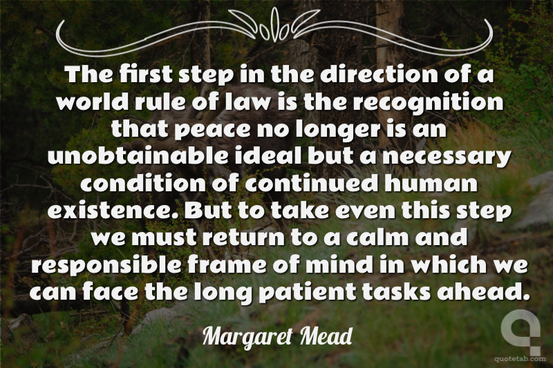 The first step in the direction of a world rule of law is the recognition that peace no longer is an unobtainable ideal but a necessary condition of continued human existence. But to take even this step we must return to a calm and responsible frame of mind in which we can face the long patient tasks ahead.
