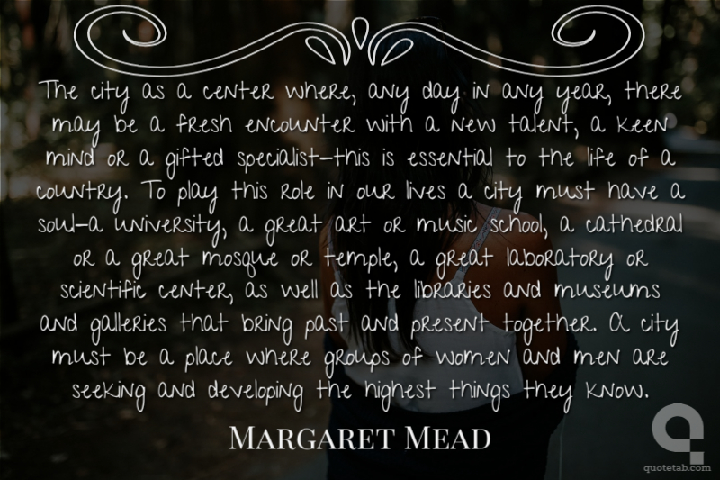 The city as a center where, any day in any year, there may be a fresh encounter with a new talent, a keen mind or a gifted specialist-this is essential to the life of a country. To play this role in our lives a city must have a soul-a university, a great art or music school, a cathedral or a great mosque or temple, a great laboratory or scientific center, as well as the libraries and museums and galleries that bring past and present together. A city must be a place where groups of women and men are seeking and developing the highest things they know.