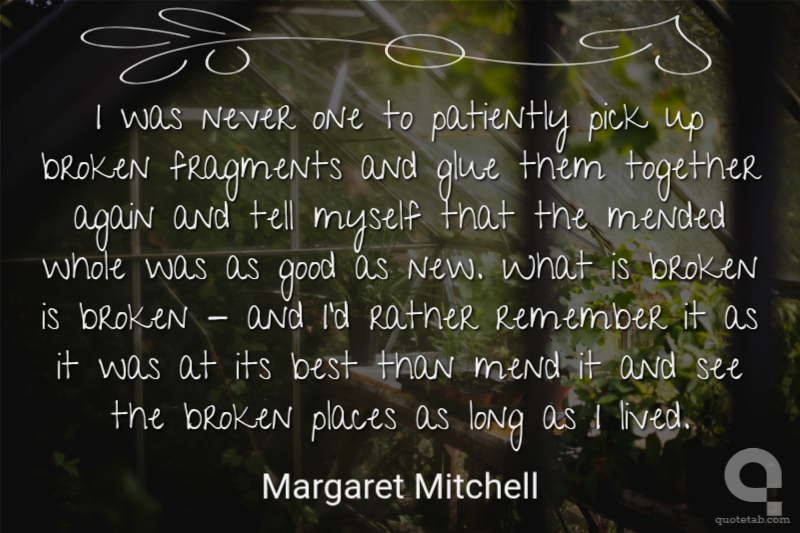 I was never one to patiently pick up broken fragments and glue them together again and tell myself that the mended whole was as good as new. What is broken is broken - and I'd rather remember it as it was at its best than mend it and see the broken places as long as I lived.