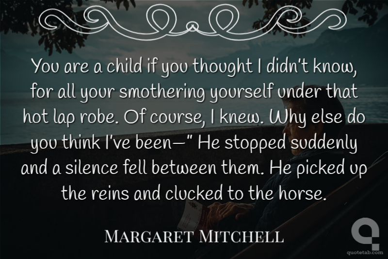 You are a child if you thought I didn’t know, for all your smothering yourself under that hot lap robe. Of course, I knew. Why else do you think I’ve been—” He stopped suddenly and a silence fell between them. He picked up the reins and clucked to the horse.